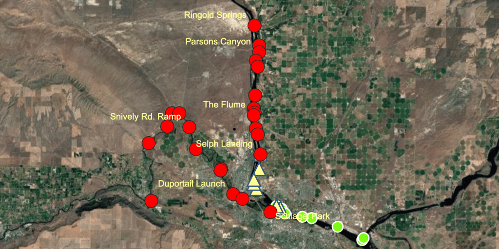 The Chiawana Water Trail Map focuses on paddling along the left bank (Franklin Co. and Pasco) of the Columbia. The Chiawana Water Trail has three sections that individually make for easy day paddles. These are from Ringold to Selph Landing, from Selph Landing to Chiawana Park and Chiawana to Sacagawea Park. The Tapteal Trail on the Yakima is also included.